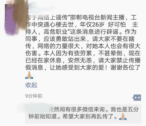 微博上暈倒的女主播為《邯鄲新聞》主播,在主持當(dāng)?shù)匾豁?xiàng)發(fā)布活動(dòng)時(shí)因勞累而暈倒在地,并被網(wǎng)友拍了視頻發(fā)在網(wǎng)上,稱其猝死。為此,彤彤特意發(fā)了一條朋友圈來(lái)辟謠,提醒大家不要傳謠以免給本人造成傷害。