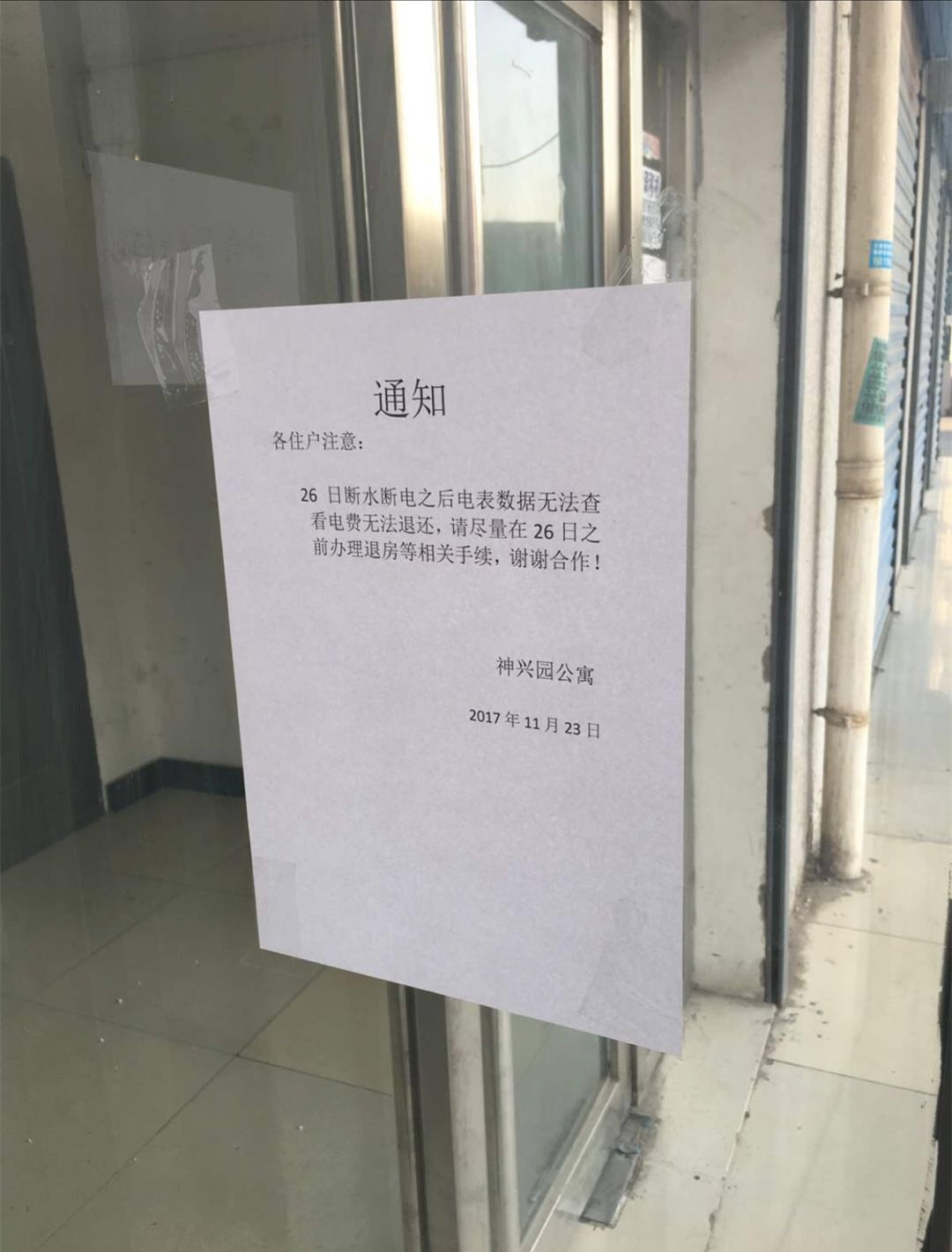 記者此前實地調(diào)查了解到,根據(jù)通州臺湖鎮(zhèn)政府下發(fā)的通知,亦園青年創(chuàng)業(yè)園周邊包括武夷公寓在內(nèi)的5家公寓應(yīng)于11月26日全面停水停電。
