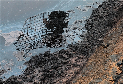 在一些洼地,可以看到一根根直接插入沙里的黑色橡膠管道,這些管道周邊的細(xì)沙呈黑色。踢開表面,下面是散發(fā)著臭味的黑色凝結(jié)物。