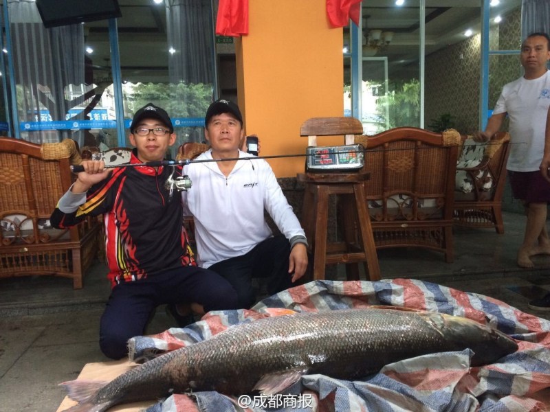 昨日凌晨,在三岔湖中,來自成都華陽的劉躍軍、劉晨父子,與水中的大魚激戰(zhàn)三個(gè)半小時(shí),終于將它弄上了岸。大魚身長(zhǎng)1.63米,重98.4斤。據(jù)資深漁友介紹,從外形上看,此魚應(yīng)為鳡魚,并非四川原生態(tài)魚種,是一種主要以小型魚類為食的兇猛魚類。