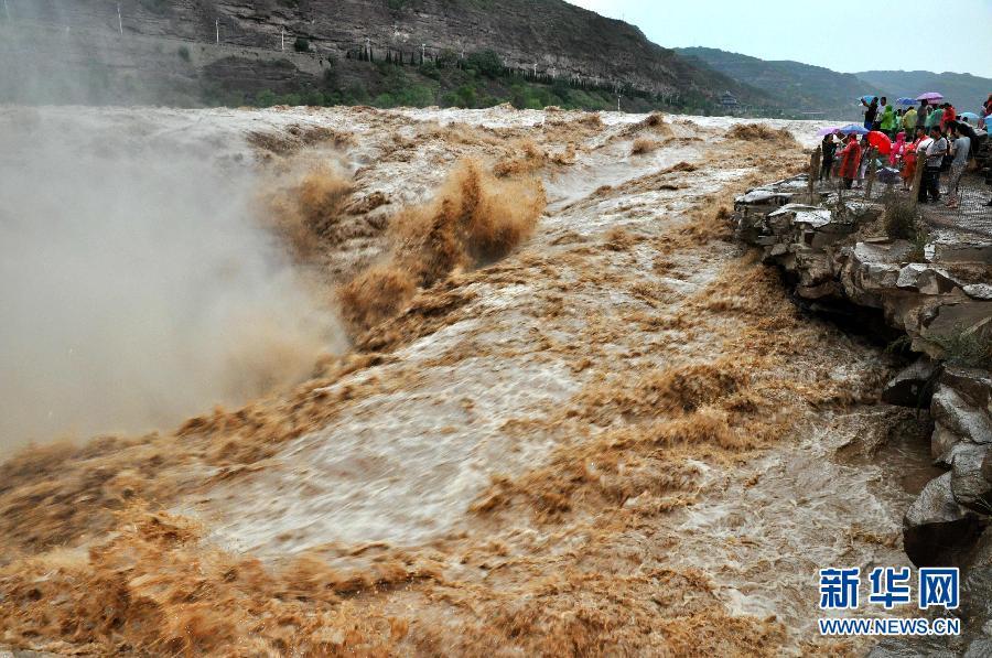 8月2日,游客在山西吉縣黃河壺口瀑布景區(qū)游覽觀瀑。受上游強降雨天氣影響,黃河干流晉陜峽谷水位暴漲,濁流滾滾奔騰而下,使得位于山西吉縣和陜西宜川交界的壺口瀑布瀑面驟然變大,形成400多米寬的特大瀑布群,氣勢磅礴,蔚為壯觀。新華社發(fā) 呂桂明 攝 圖片來源:新華網(wǎng)
