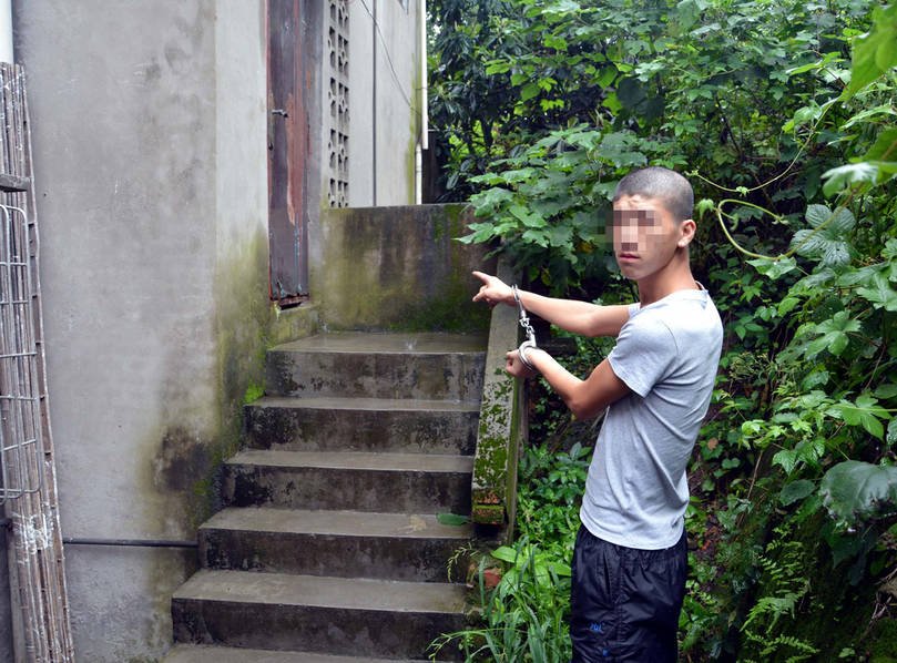 陳警官介紹,鄧和唐都是重慶市榮昌縣人,父母都在外地打工,因和家里有矛盾,唐某帶著1000元錢和鄧某回到了重慶,本來準(zhǔn)備找份工作,但1000元很快花完了,也沒有找到像樣的工作,于是就起了賊心。鄧某和唐某第一次偷盜的金額就有5100元,對他們來講已經(jīng)算是巨資,所以才想著拍照“留念”。圖為唐某指認(rèn)現(xiàn)場。