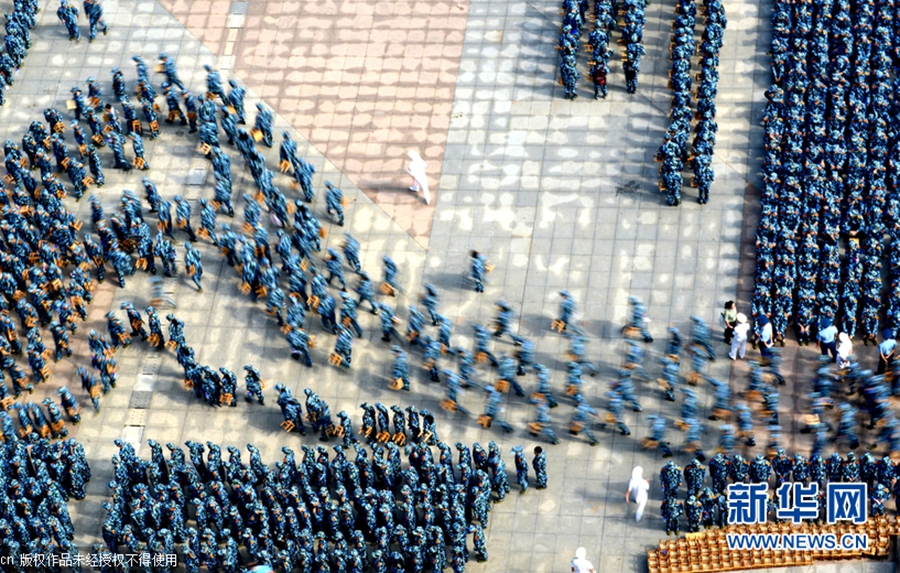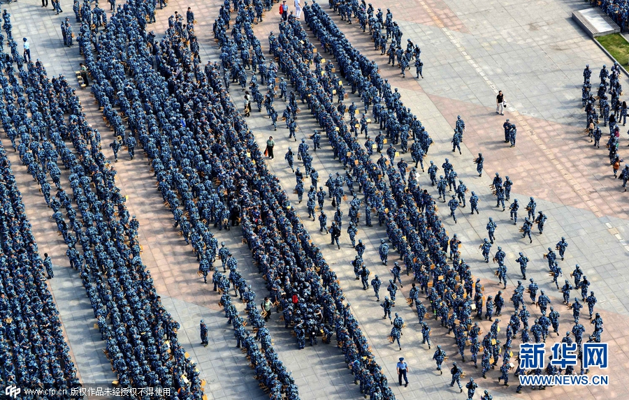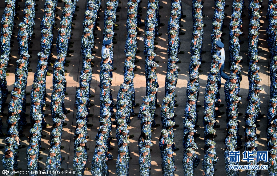 2015年9月14日,湖北武漢,當日上午,武漢理工大學2015級本科生開學典禮暨軍訓動員大會在該校南湖校區(qū)舉行,全校多個校區(qū)約9000名新生身著迷彩戎裝一起進行軍訓,場面震撼壯觀。南湖校區(qū)現(xiàn)場集合了約7000名新生參與軍訓,隊列整齊、英姿颯爽,熱情投入軍訓,開啟了朝氣蓬勃的大學新生活。圖片來源:cfp