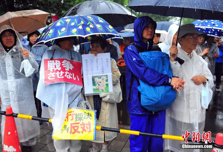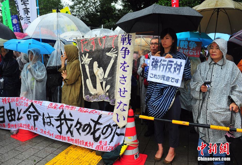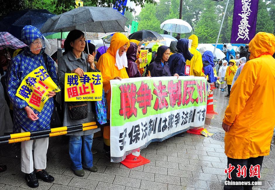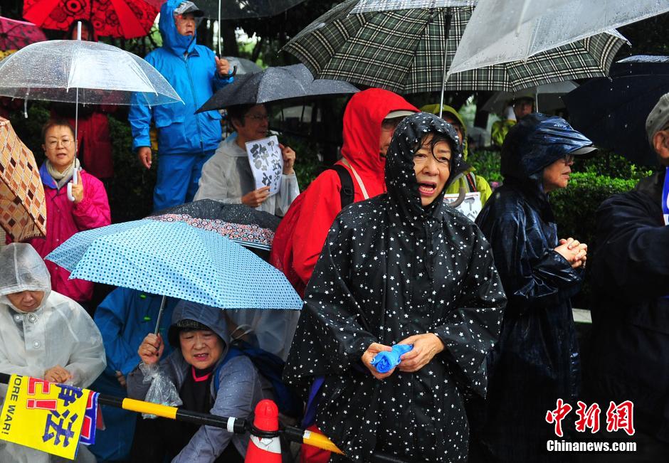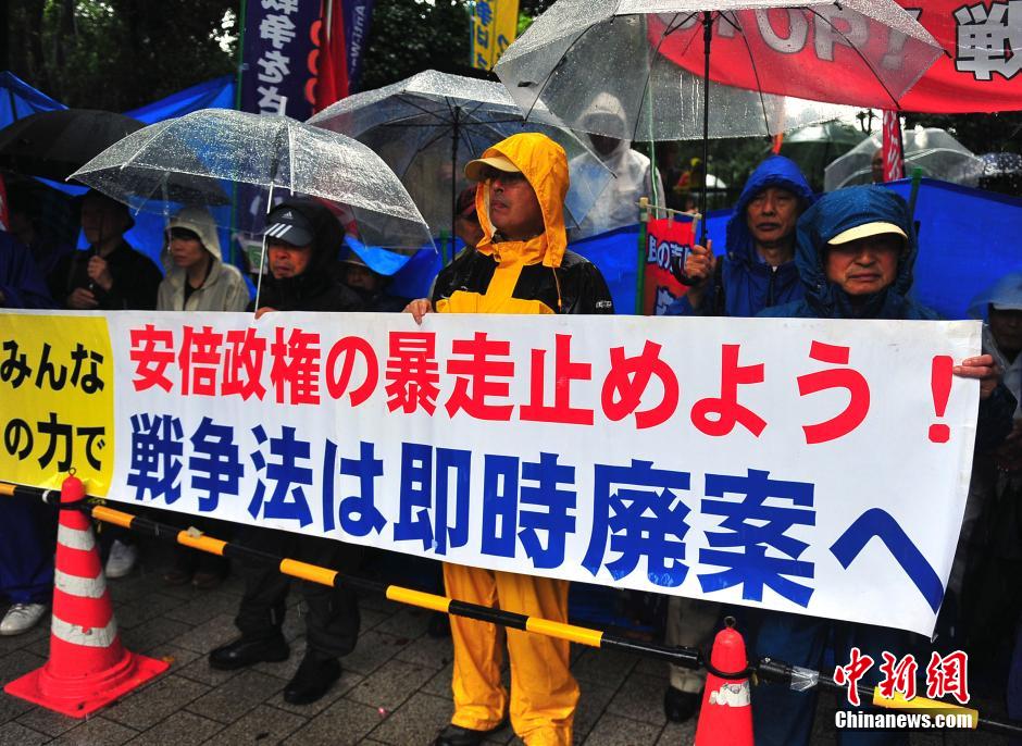 隨著安倍陣營(yíng)強(qiáng)推以解禁集體自衛(wèi)權(quán)為核心內(nèi)容的安保法案最終過(guò)關(guān)的計(jì)劃進(jìn)入“倒計(jì)時(shí)”,日本民眾的反安??棺h活動(dòng)再度進(jìn)入高潮。在之前徹夜抗議之后,9月17日白天,又有眾多日本民眾冒著大雨持續(xù)聚集在國(guó)會(huì)周邊進(jìn)行抗議活動(dòng)。中新社發(fā) 王健 攝