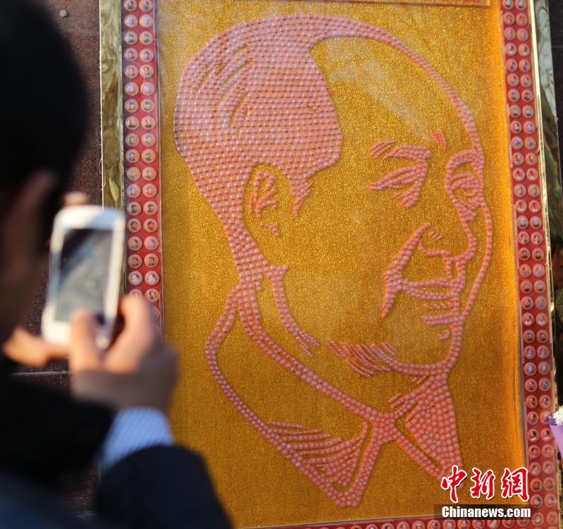 12月26日,是毛澤東誕辰122周年紀(jì)念日,鄭州退休老軍人李廷林制作的徽章版毛澤東畫像在河南鄭州紫荊山廣場展出,該畫像總共由1828枚徽章圍成。中新社記者 王中舉 攝