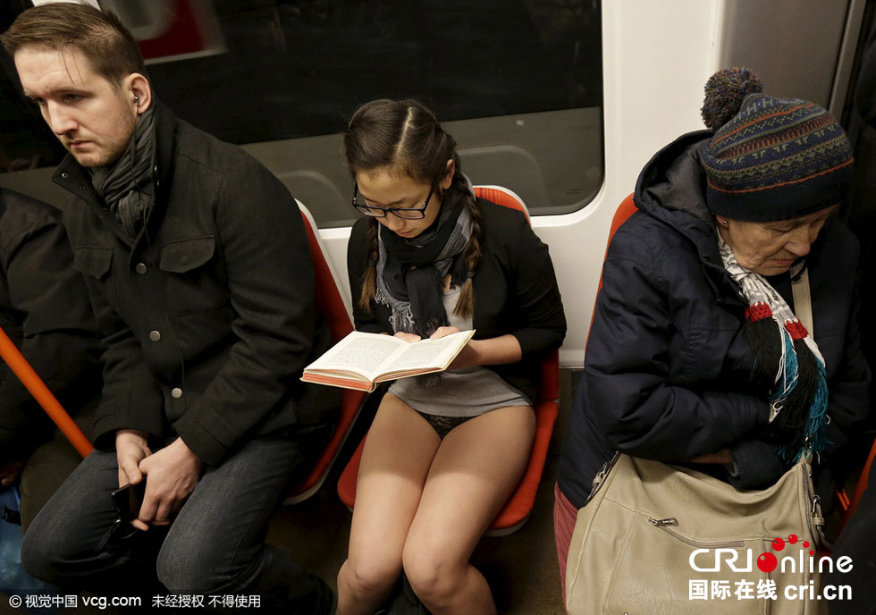 當(dāng)?shù)貢r(shí)間2016年1月10日,捷克布拉格,“地鐵無(wú)褲日”當(dāng)天,乘客穿短褲乘車。圖片來(lái)源:視覺中國(guó)