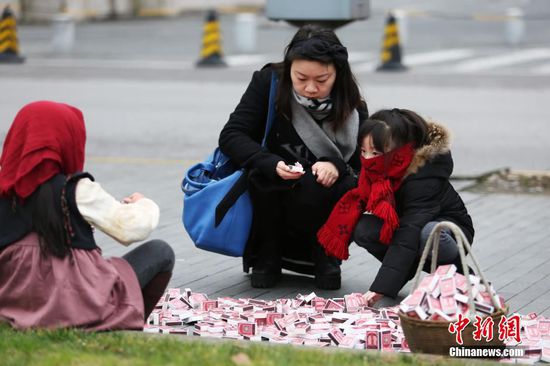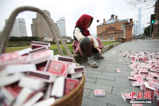 1月12日,上海外灘街頭出現(xiàn)一位小女孩,她身穿古典長(zhǎng)裙,頭裹赭紅色圍巾,挎著裝滿火柴的小竹籃,在寒風(fēng)中向過(guò)往的路人送小火柴。據(jù)了解,這是一次“愛(ài)心衣櫥”幫助中國(guó)山區(qū)孩子擺脫寒冷的愛(ài)心募捐活動(dòng)。在寒冷的冬天,他們嘗試以“賣(mài)火柴的小女孩”活動(dòng),喚起社會(huì)的關(guān)注,把更多的溫暖傳遞到中國(guó)山區(qū)寒冷孩子的手上。只要掃一掃火柴盒上的二維碼,就可以立刻向山區(qū)孩子送上一套溫暖新衣。張亨偉 攝