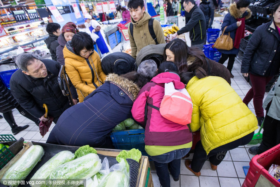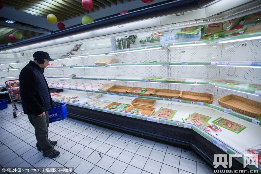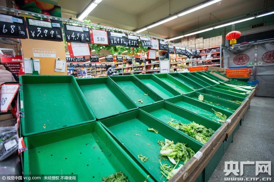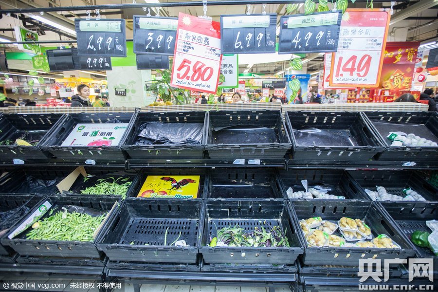 2016年1月20日,浙江省杭州市,杭州市氣象臺發(fā)布暴雪黃色預警信號。寒潮將至,市民紛紛囤積食品,眾多貨架被一搶而空。