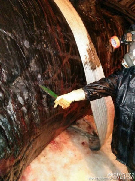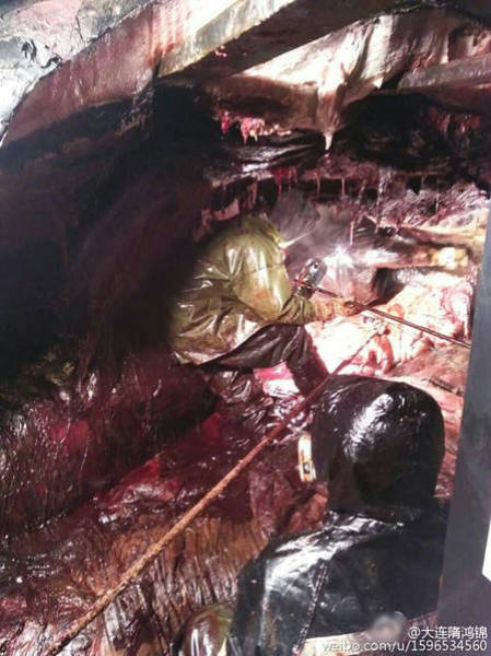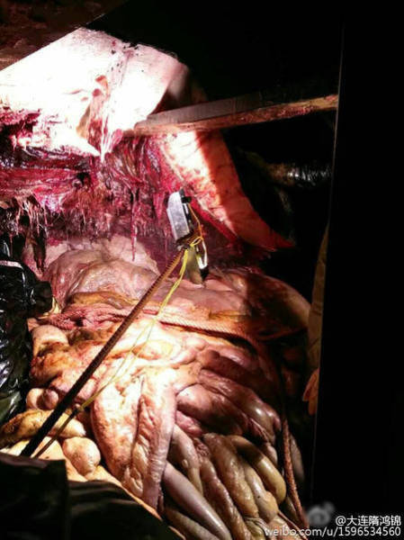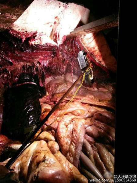 2016年2月14日至15日,江蘇如東洋口港海灘先后發(fā)現(xiàn)兩條抹香鯨擱淺死亡。19日,技術(shù)專家開始抹香鯨的開腹工作,其中一位專家進(jìn)入了抹香鯨的體內(nèi),在工作之時(shí)拍下了體內(nèi)的情況。