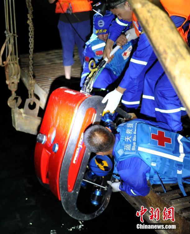 6月6日,四川廣元沉船事故救援現場,參與救援的水下機器人先后兩次下水,并通過攝像頭在翻沉的“雙龍”號船內發(fā)現有遇難者以及一些漂浮物品。圖為救援人員將水下機器人抬放入水。中新社記者 劉忠俊 攝