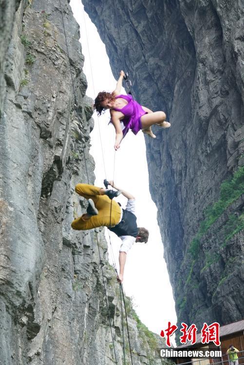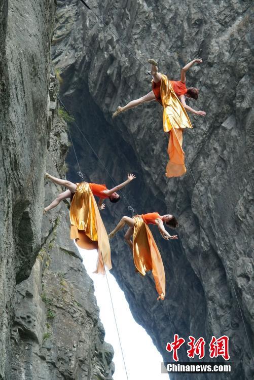 9月13日,美國BANDALOOP高空舞蹈團在湖南張家界天門山的懸崖絕壁間盡情展現“垂直舞蹈”的藝術與魅力,其優(yōu)雅而驚險的舞姿與鬼斧神工般的自然奇景融合、互動,吸引了不少游客駐足欣賞。中新社發(fā) 向韜 攝