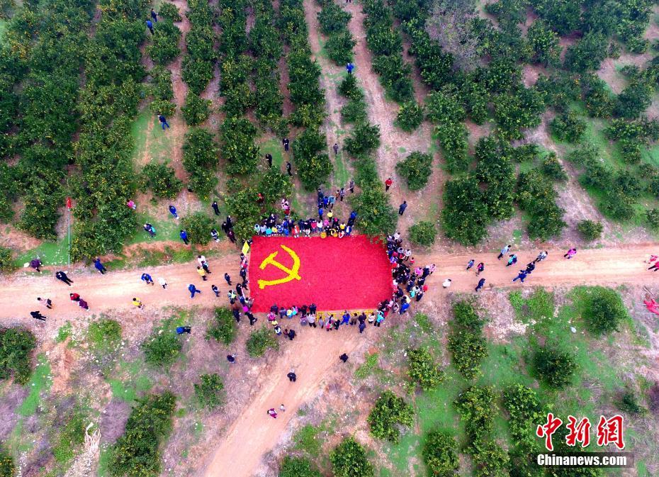 11月6日,南水北調(diào)中線工程水源地——河南淅川丹江大觀苑,滿園的桔子喜獲豐收,枝頭上碩果累累,多位農(nóng)民在桔子地里用豐收的金黃桔子和當(dāng)?shù)氐奶禺a(chǎn)紅辣椒拼成鮮艷奪目的巨幅黨旗。一位農(nóng)民告訴記者,為了拼這幅圖案,他們十幾個人整整用了兩天時間。吳揚 攝