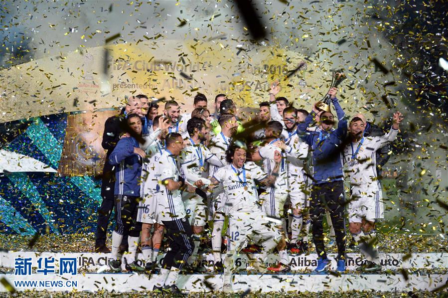 12月18日,皇家馬德里隊球員在世俱杯頒獎儀式上歡呼慶祝。新華社記者馬平攝