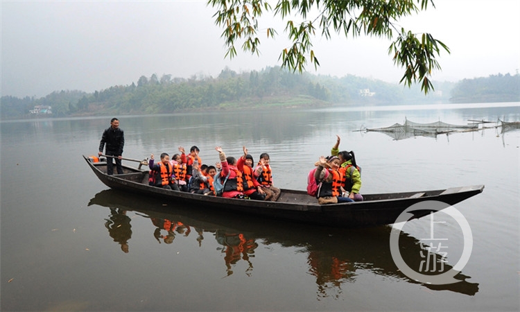 每當(dāng)上學(xué)放學(xué)的時(shí)候,在大足區(qū)響水灘水庫,平靜的水面上,總能看見一條小小的木船來回穿梭。上學(xué)時(shí),撐船的人把岸邊的孩子一個(gè)一個(gè)牽上小船;放學(xué)時(shí),撐船的人把船上的孩子一個(gè)一個(gè)牽下小船。