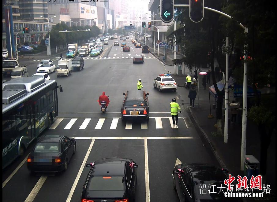 2月22日,湖北宜昌一位新郎在迎親時(shí),迎親車隊(duì)的頭車因涉嫌套牌被交警查獲。在新郎家屬和交警溝通后,當(dāng)?shù)亟痪诵曰瘓?zhí)法,先“開道護(hù)送”,迎親結(jié)束后才扣下套牌車。圖為交警將套牌婚車成功攔截。石寧 攝