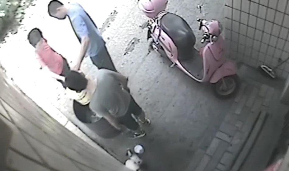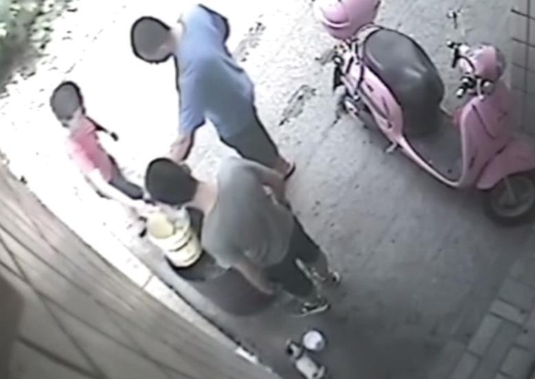 “然后我們以為那個小狗,那個桶那么高,它怎么能跳進去。然后我們就調(diào)監(jiān)控,發(fā)現(xiàn)是鄰居家小孩做的。”圖為男童抓起小狗將其扔進火盆。