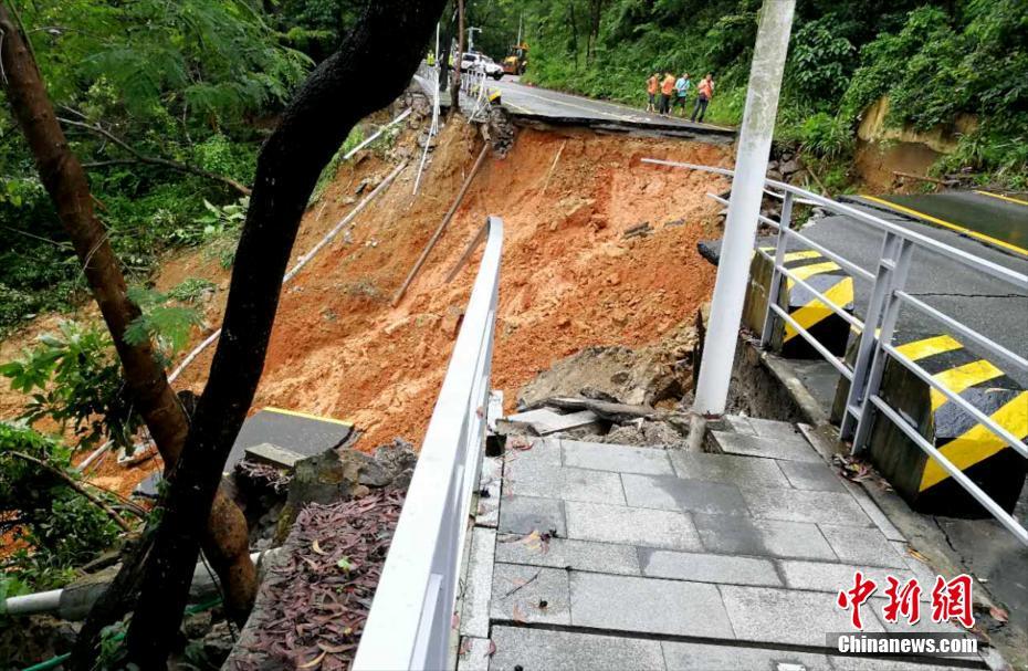7月18日,深圳普降大暴雨局部特大暴雨,致部分路段嚴(yán)重積水、山體滑坡道路中斷、交通擁堵等險(xiǎn)情。深圳鹽田區(qū)盤山公路恩上路段出現(xiàn)滑坡,無人員、車輛被困;深鹽二通道下沙頭角出口匝道中間因山水傾瀉,道路中斷,交警已經(jīng)實(shí)施了交通管制。當(dāng)?shù)貧庀蟛块T先后發(fā)布了雷電、暴雨黃色、暴雨橙色和暴雨紅色分區(qū)預(yù)警信號。圖為深圳鹽田區(qū)盤山公路恩上路段出現(xiàn)滑坡道路中斷。中新社記者 鐘新 攝