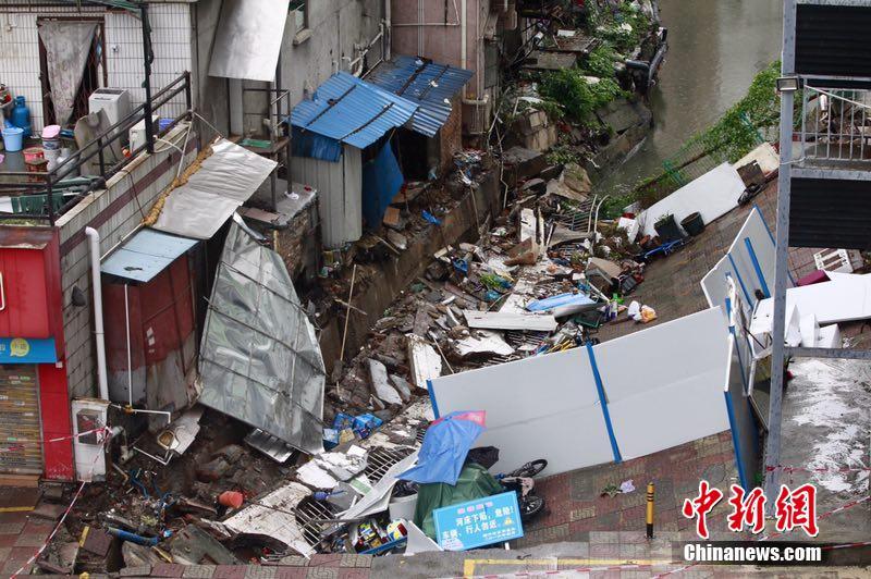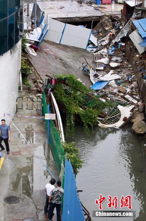 7月18日,深圳普降大暴雨局部特大暴雨,致部分路段嚴(yán)重積水、山體滑坡道路中斷、交通擁堵等險(xiǎn)情。深圳鹽田區(qū)盤山公路恩上路段出現(xiàn)滑坡,無人員、車輛被困;深鹽二通道下沙頭角出口匝道中間因山水傾瀉,道路中斷,交警已經(jīng)實(shí)施了交通管制。當(dāng)?shù)貧庀蟛块T先后發(fā)布了雷電、暴雨黃色、暴雨橙色和暴雨紅色分區(qū)預(yù)警信號。圖為深圳寶安區(qū)西鄉(xiāng)永安商業(yè)城門前區(qū)域坍塌,長約15米、寬約6米的塌陷。中新社記者 鐘新 攝