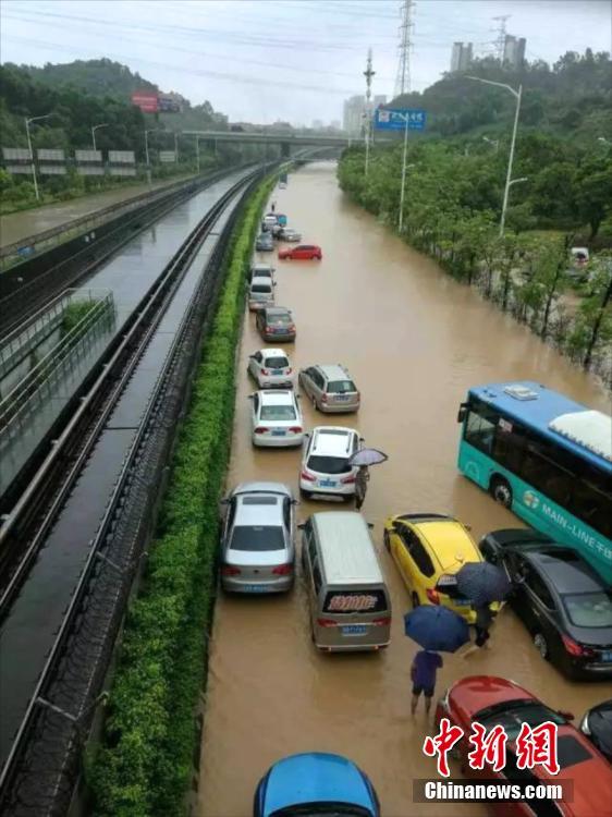 7月18日,深圳普降大暴雨局部特大暴雨,致部分路段嚴(yán)重積水、山體滑坡道路中斷、交通擁堵等險(xiǎn)情。深圳鹽田區(qū)盤山公路恩上路段出現(xiàn)滑坡,無人員、車輛被困;深鹽二通道下沙頭角出口匝道中間因山水傾瀉,道路中斷,交警已經(jīng)實(shí)施了交通管制。當(dāng)?shù)貧庀蟛块T先后發(fā)布了雷電、暴雨黃色、暴雨橙色和暴雨紅色分區(qū)預(yù)警信號。圖為深圳龍崗金銀坑路段嚴(yán)重積水。中新社記者 鐘欣 攝