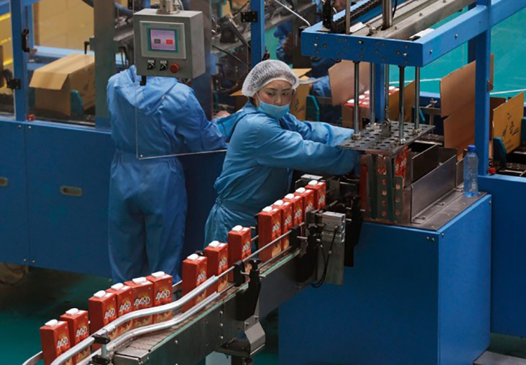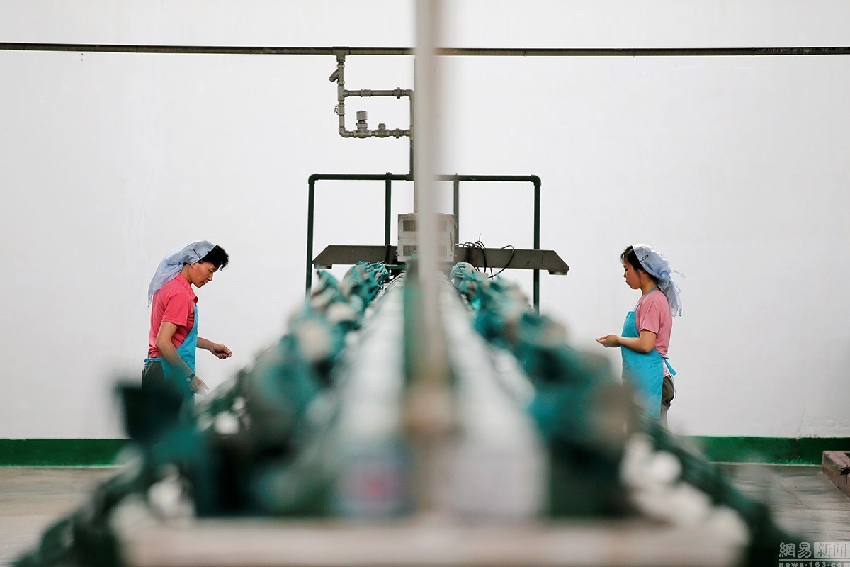 工人在一家工廠的果汁生產(chǎn)線進(jìn)行操作,這附近的Daedonggang水果農(nóng)場(chǎng)坐落在平壤郊區(qū),擁有125公頃的蘋果樹(shù)。
