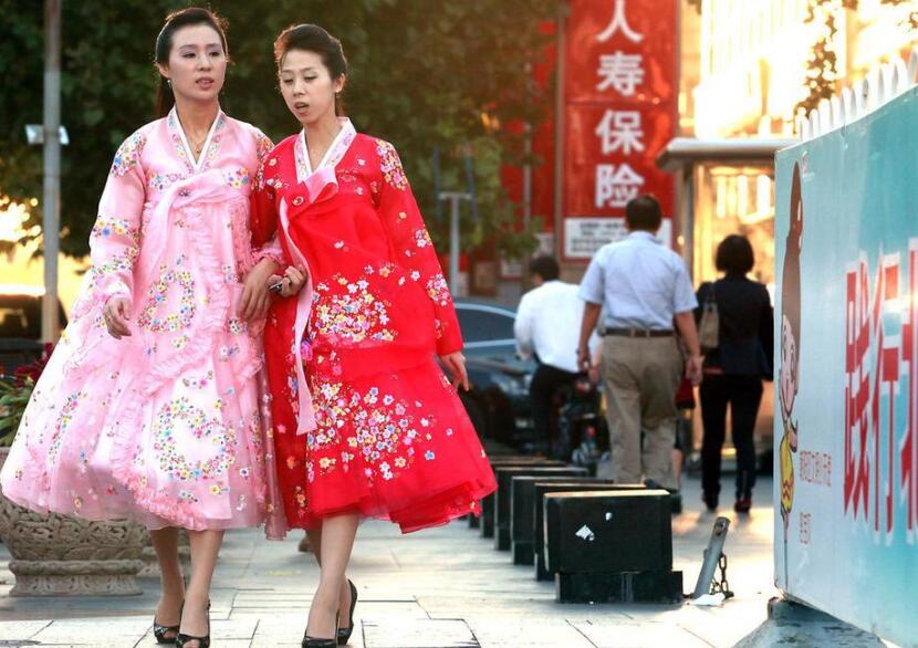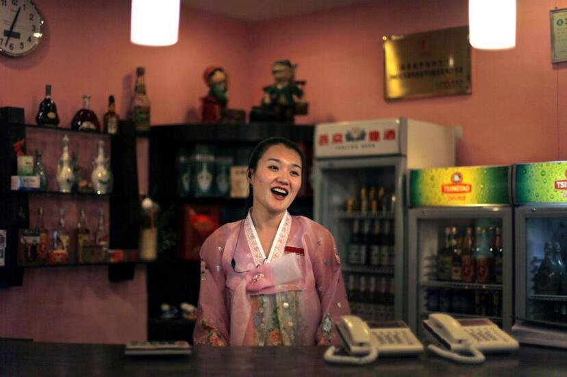 朝鮮餐廳的服務(wù)員在表演歌舞。