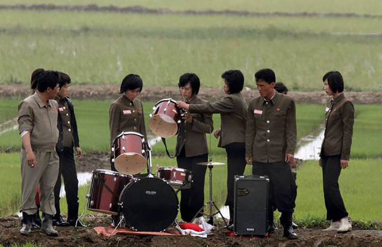 在黃金坪舉辦完歡迎農(nóng)民的儀式后,樂(lè)隊(duì)成員再在田間檢查鼓。