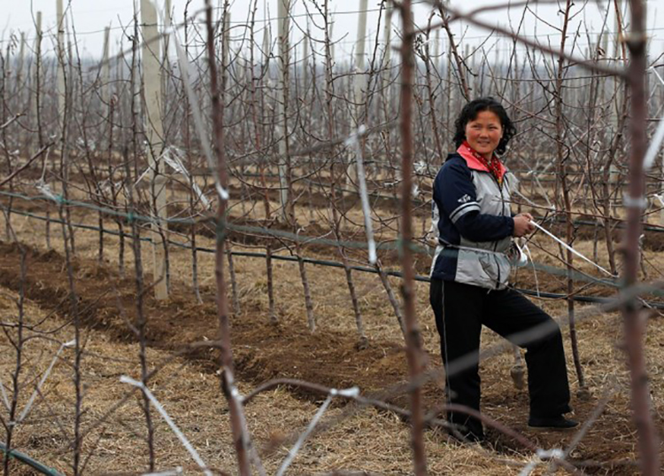 一位女工面帶微笑地站在她工作的Daedonggang水果農(nóng)場(chǎng)。