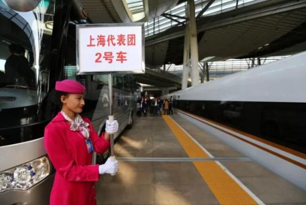 ▲2017年10月16日,上海市十九大代表乘坐“復(fù)興號”高鐵列車抵達(dá)北京南站。