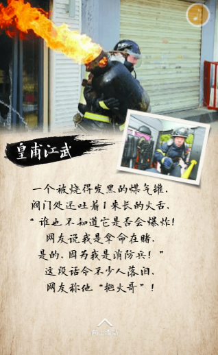 原本休假的他帶著兒子出去玩,偶遇火災(zāi),他將不滿兩歲的孩子托付給陌生路人照看,拿著滅火器,不顧個(gè)人安危,沖向樓頂滅火。他說:“我是消防員,不論任何時(shí)候,無論身上是否有軍裝!”