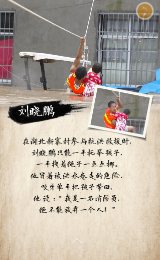 在湖北新寨村參與抗洪救援時(shí),劉曉鵬只能一手托舉孩子,一手拽著繩子一點(diǎn)點(diǎn)挪。他冒著被洪水卷走的危險(xiǎn),咬牙單手把孩子帶回 ,他說:“我是一名消防員,絕不能放棄一個(gè)人!”