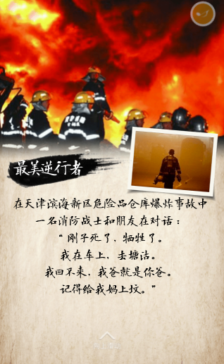 在天津?yàn)I海新區(qū)危險(xiǎn)品倉庫爆炸事故中,一名消防戰(zhàn)士和朋友在對(duì)話:“剛子死了,犧牲了。我在車上,去塘沽。我回不來,我爸就是你爸。記得給我媽上墳?!?/p>