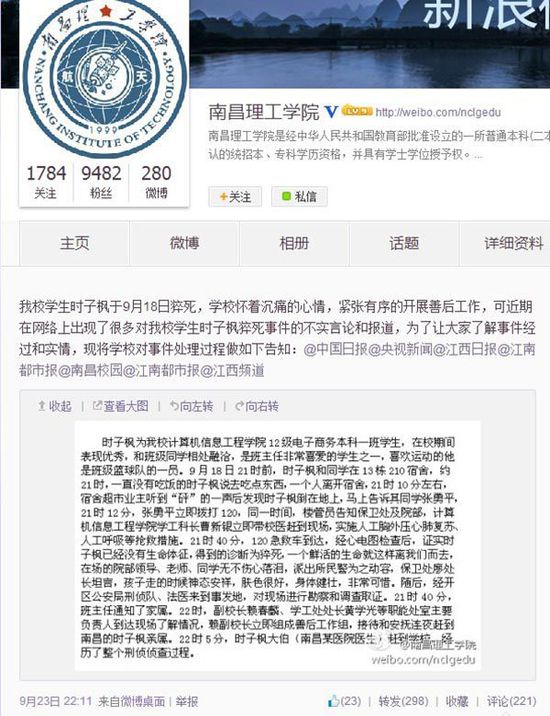 9月23日,南昌理工學(xué)院發(fā)布官方微博,就時子楓猝死一事解釋稱,事發(fā)后,時子楓的同學(xué)撥打了120,同一時間,樓管員通知了保衛(wèi)處以及院部,相關(guān)領(lǐng)導(dǎo)趕到現(xiàn)場急救,21時40分,120急救到場后,證實時子楓已經(jīng)沒有生命體征,被診斷為猝死。該校的官微還指出,網(wǎng)上出現(xiàn)了一些不實言論,特此澄清,但并未解釋死因以及打人之事。