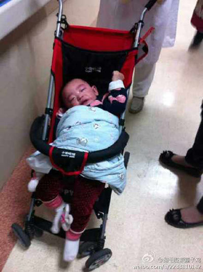 10月15日晚7點(diǎn)30分左右,一名女子將16個(gè)月大的女?huà)脒z棄在上海市第一人民醫(yī)院兒科門(mén)診大廳。 新浪微博@翻毛腔額童子雞 圖