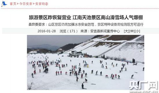 雖然安吉縣委宣傳部副部長祝青稱滑雪場(chǎng)營業(yè)馬上就結(jié)束了,但根據(jù)安吉縣政府官方網(wǎng)站報(bào)道,1月28號(hào),江南天池滑雪場(chǎng)恢復(fù)營業(yè),人氣爆棚。