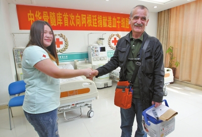 4月18日14時(shí)44分,黃發(fā)碧眼的志愿者喬治(英文全名:GeorgesJeanMarianelli),走進(jìn)河南省腫瘤醫(yī)院造血干細(xì)胞采集室,徑直走到病床邊,向正躺在病床上采集造血干細(xì)胞的河南姑娘武佳微笑示意,走上前去說(shuō)“你好”,并為她豎起大拇指。幾分鐘后,病床邊的造血干細(xì)胞采集機(jī)停止運(yùn)轉(zhuǎn),這位26歲的河南姑娘捐獻(xiàn)的199毫升造血干細(xì)胞混懸液,被醫(yī)護(hù)人員小心翼翼地取下……這份飽含河南大愛(ài)的“生命種子”,將搭乘飛機(jī),輾轉(zhuǎn)被送到萬(wàn)里之外的阿根廷,為一名8歲白人兒童送去生命希望。