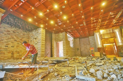大廳內(nèi),金碧輝煌的樓頂和墻體以及各種燈飾等都還沒有拆除,大廳東側(cè)的一處1尺高的平臺正在拆除。在切割、拉扯、裝卸等雜音交響中,東北角一名工人拿著大錘對著室內(nèi)非承重墻猛砸,已砸出一個大窟窿。很顯然,這里正進行大規(guī)模拆除。
