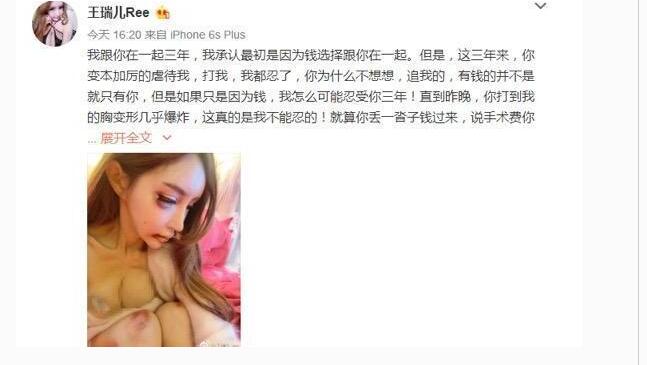 近日,曾有“第一網(wǎng)紅”之稱的嫩模王瑞兒在微博發(fā)文自曝被男友嚴重家暴,她大膽曬出右眼紅腫不堪、嘴角流血的“被虐打”慘狀,并稱胸被打到“變形幾乎爆炸”,和劉梓晨神似龍鳳胎。據(jù)稱,王瑞兒整容過的假胸價值高達百萬。王瑞兒自稱與男友交往三年,大方承認最初在一起是貪圖對方“有錢”,三年來遭受了無休止的虐待和毆打,此次更是變本加厲險些將胸“打爆”,這才怒而提出分手:“請你滾蛋,從此遠離我的生活……如果再跟你在一起,我將萬劫不復(fù)!”