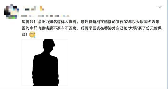 5月1日,某大號(hào)在社交平臺(tái)爆料稱:“厲害啦!據(jù)業(yè)內(nèi)知名媒體人爆料,最近有新劇在熱播的某位97年以大眼聞名娛樂圈的小鮮肉賺錢后不買車不買房,反而斥巨資在香港為自己的“大眼”買了份天價(jià)保險(xiǎn)!”