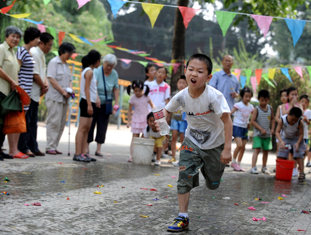 游戲規(guī)則:跑道前方設(shè)置一個(gè)水桶 起點(diǎn)外設(shè)置一個(gè)大塑料瓶,比賽開(kāi)始時(shí),小朋友持水杯到水桶內(nèi)盛水后返回倒入大塑料瓶處,由孩子和兩個(gè)家長(zhǎng)依次進(jìn)行盛水接力,大塑料瓶盛滿(mǎn)水者為勝(注:塑料瓶身內(nèi)設(shè)若干漏點(diǎn))?;顒?dòng)共7個(gè)家庭參與,取前三名進(jìn)行頒獎(jiǎng),所有參與的家庭均有參與獎(jiǎng)。