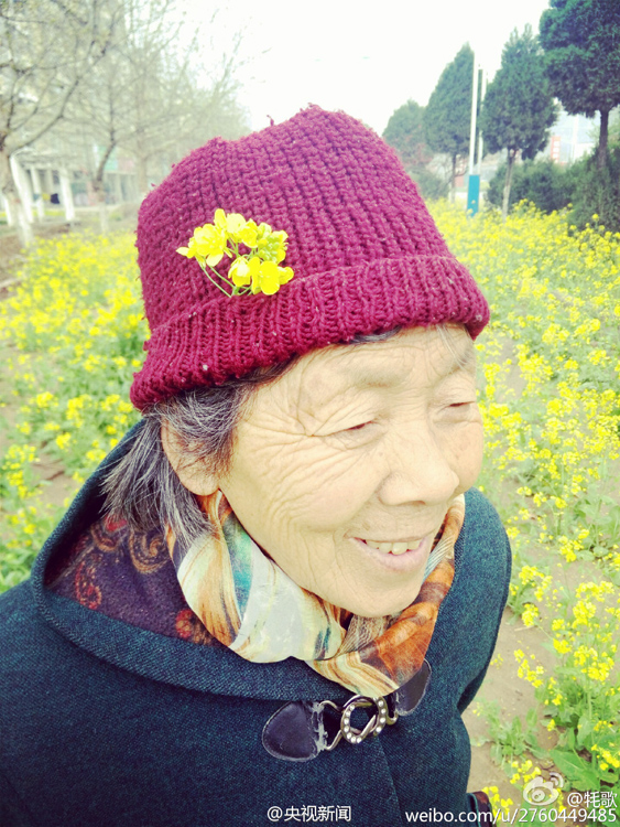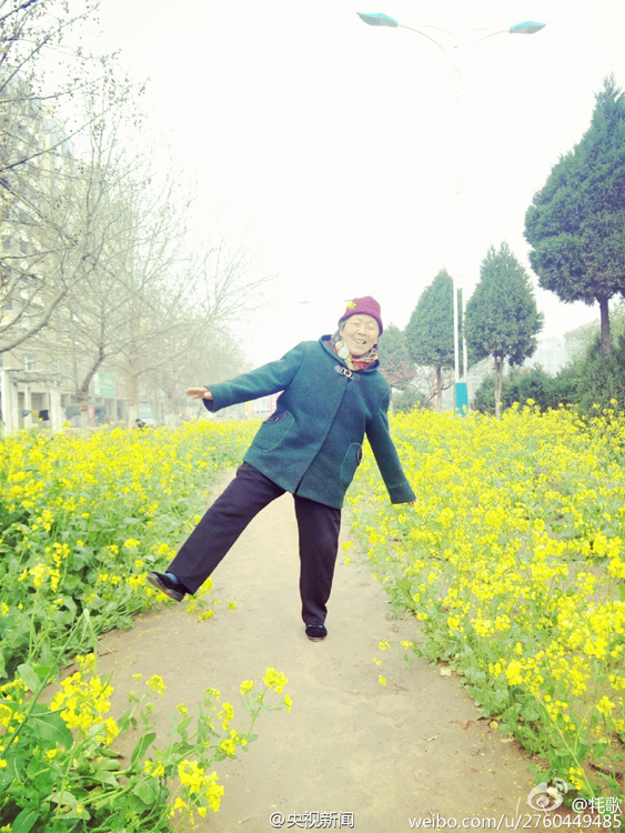 4月4日,網(wǎng)友“牦歌”在微博上曬出了一組照片,題為“你的皺紋比歲月更美”,照片的主角是“我奶奶”。一片金黃的油菜花田中,一位身穿灰色大衣,頭戴棗紅色線(xiàn)帽的老人或轉(zhuǎn)身回眸淺笑,或低頭輕聞花香,還45°角仰望天空,甚至單腳站立擺出“大”字狀。最可愛(ài)的要數(shù)老人擷取了一支油菜花插在耳邊,如果不是面龐已布滿(mǎn)皺紋,老人就如同一個(gè)嬌羞的小姑娘。圖為奶奶45°角仰望天空。