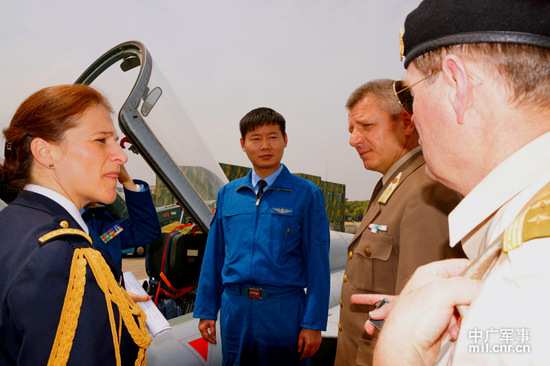 “飛豹雄獅”飛行大隊(duì)長劉杰向駐華武官介紹“飛豹”戰(zhàn)機(jī)