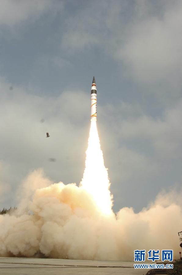印度當(dāng)?shù)貢r(shí)間19日8時(shí)7分(北京時(shí)間10時(shí)37分)從東部惠勒島試射了自主研制的、射程超過5000公里并可攜帶多枚核彈頭的烈火-5型中程彈道導(dǎo)彈。