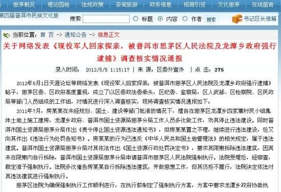 關于網絡發(fā)表《現(xiàn)役軍人回家探親,被普洱市思茅區(qū)人民法院及龍?zhí)多l(xiāng)政府強行逮捕》調查核實情況通報