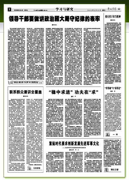 軍隊(duì)各級(jí)領(lǐng)導(dǎo)干部是部隊(duì)的帶兵人,無疑也應(yīng)當(dāng)成為講政治、顧大局、守紀(jì)律的“排頭兵”。領(lǐng)導(dǎo)干部只有自覺響應(yīng)胡主席提出的講政治、顧大局、守紀(jì)律的要求,積極參加學(xué)習(xí)教育活動(dòng),不斷強(qiáng)化政權(quán)意識(shí)、責(zé)任意識(shí)和憂患意識(shí),高標(biāo)準(zhǔn)、嚴(yán)要求、做模范,才能帶領(lǐng)官兵把我軍真正建設(shè)成為軍魂意識(shí)牢固、履行使命堅(jiān)強(qiáng)的軍隊(duì)。