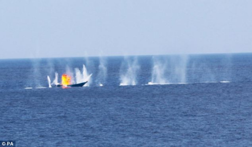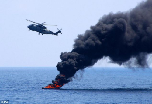 “隼”式直升機(jī)對海盜船進(jìn)行掃射
