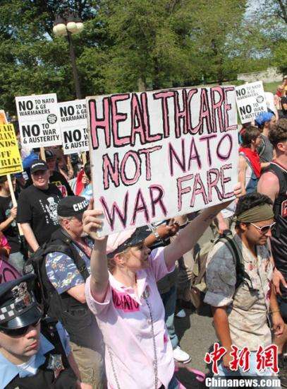 北約峰會5月20日在芝加哥開幕,萬余名示威者掀起規(guī)??涨暗挠涡锌棺h活動。圖為當天游行中的一個場景,右側(cè)為正在執(zhí)勤的警察,中為一名美女示威者,左側(cè)為一名參加過阿富汗戰(zhàn)爭的美國退伍軍人。中新社發(fā)李洋攝