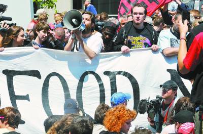 5月21日,一名“占領(lǐng)芝加哥”活動的抗議者在“要食物不要炸彈”的橫幅前發(fā)表反戰(zhàn)演講。當日,近千名抗議者在美國總統(tǒng)奧巴馬的競選總部大樓外進行示威活動,要求奧巴馬政府和北約立即停止戰(zhàn)爭。新華社記者 張保平攝