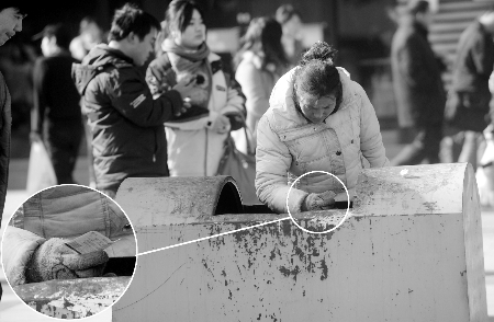 昨日上午11時許,在鄭州火車站北出站口旁,一名穿藍色棉襖的女子一直站在垃圾桶旁邊,手拎著裝有塑料瓶的黑色袋子,見人扔東西就盯著人家的手。