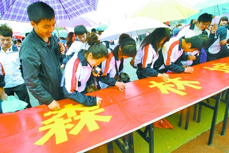 大學(xué)生在創(chuàng)建森林城市工作啟動(dòng)儀式上簽名