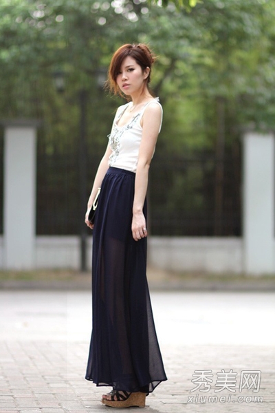 白色背心搭配黑色半身長裙,還是透視感的款式,特別有T臺(tái)的感覺。簡約的黑白配清新淡雅,散發(fā)著一種低調(diào)的時(shí)尚感。